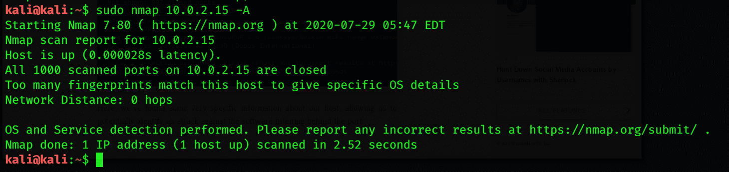 A useful thing to know about a device is its OS. By using Nmap, you can identify and detect the operating system the device is using. Use the following terminal emulator command to do so: