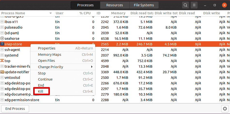 In the System Monitor window, you will see a list of processes running in your system. In order to kill a process, right-click it, and select Kill option. It will kill the selected process instantly.