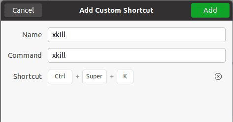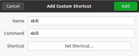 Then in the following dialog, name the shortcut and type xkill in the Command field and click Set Shortcut button.