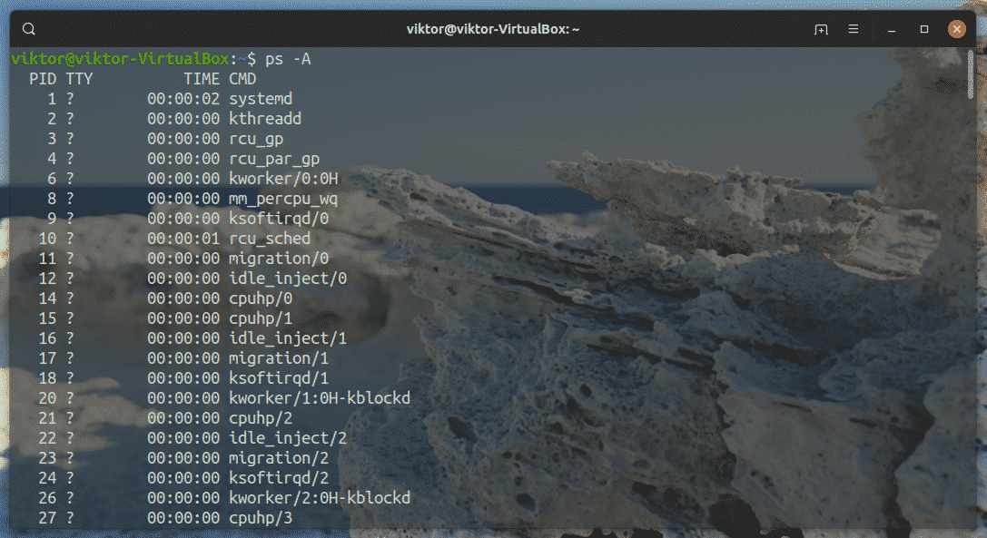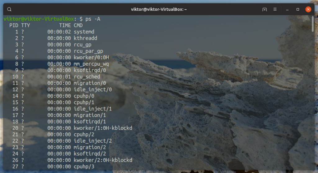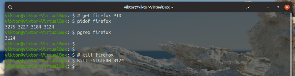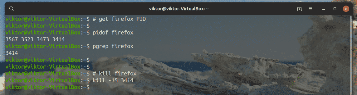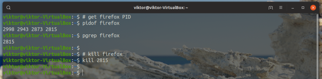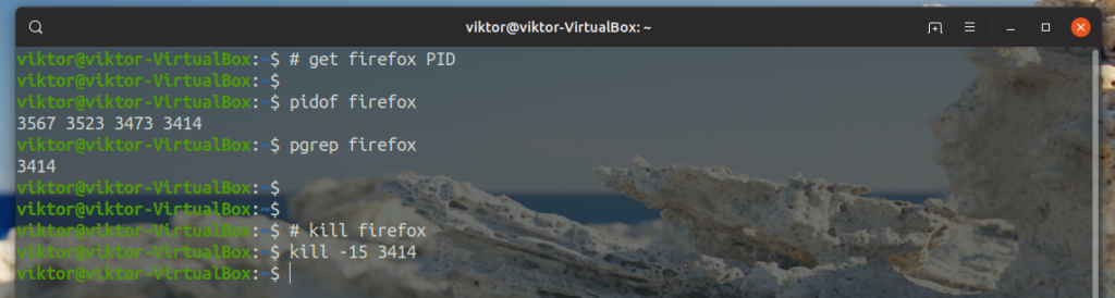 The very first task is identifying the PID (process identification number) and/or the process name that you’d like to terminate. For this example, I’ll be using Firefox as the target process to terminate. Run the following command to list all the running processes on the system.