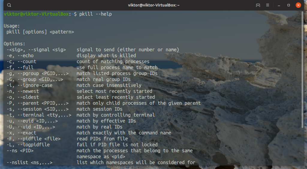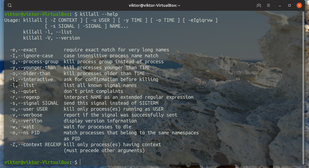 Want to terminate all the processes that are running under a certain user? Killall can do the job, no problem. Be careful when running this one as it might break down the system and create other issues. It won’t work if you’re trying to terminate processes that are running under a different user with higher privilege.