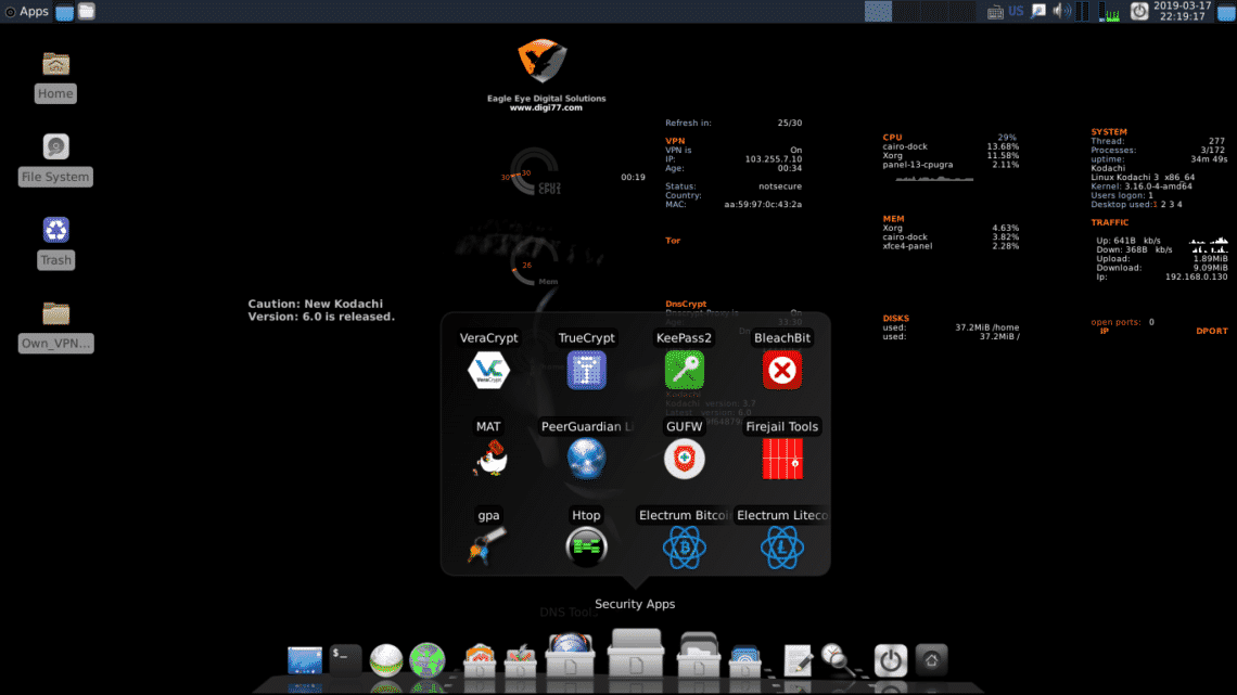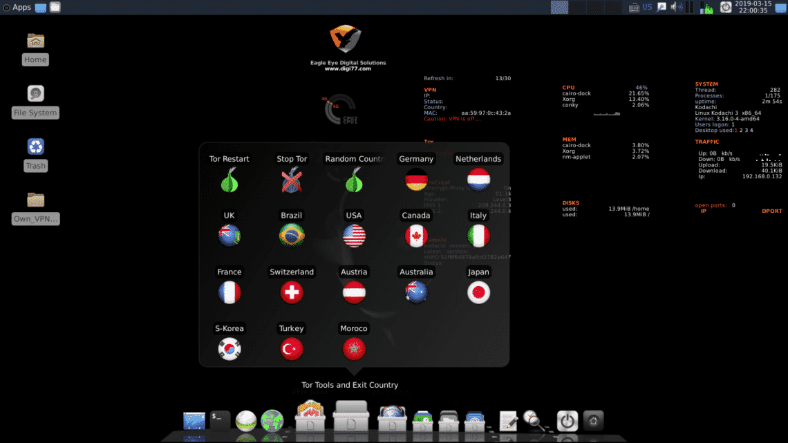 When Kodachi boots up, it changes your MAC Address, establishes TOR (The Onion Routing) connection through a paid VPN and all of the internet traffic has to go through TOR plus VPN with DNS encryption. Also it changes your MAC Address regularly after a while to avoid detection and tracking on the internet.