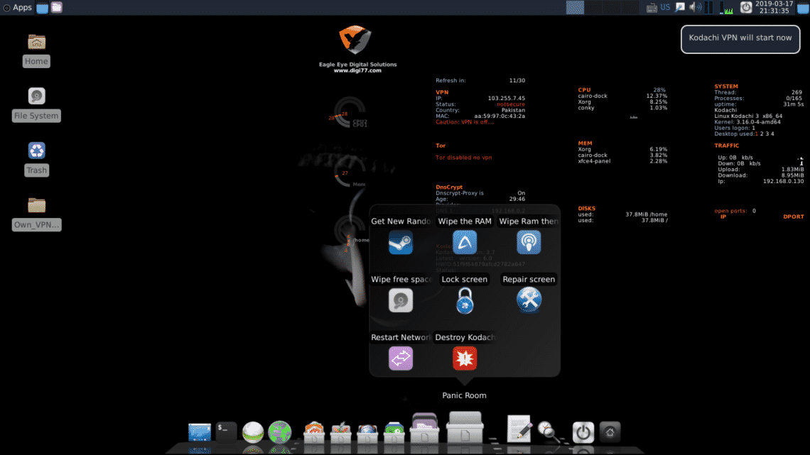 If something goes wrong while surfing the web, there is a “Panic Room” folder specially built for emergency situations where you can wipe Hard Disk, RAM and destroy kodachi completely. By using these options, no will be able to trace you back or perform any type of Forensics on host’s system because it will leave no traces on the system even on RAM. Also if you’ve installed Kodachi on your Hard drive and you want a complete re-install with no traces of previous Kodachi, then you can do it within the live session without any extra effort. The built-in tools save all configurations and settings and can resume your working from where you left.