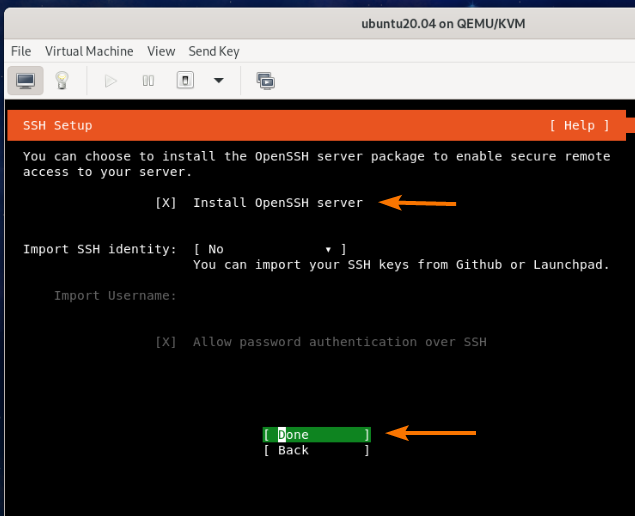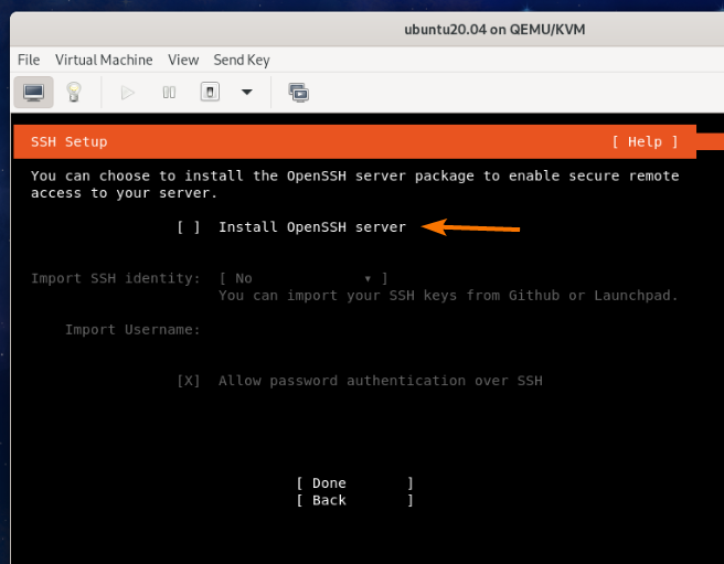To do that, select Install OpenSSH server and press <Space Bar>.