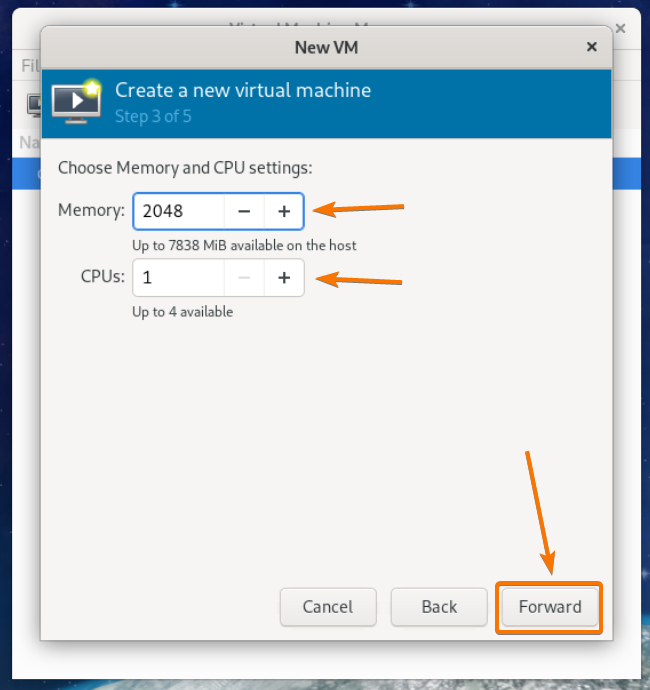 I will use 2 GB or 2048 MB of memory and 1 CPU core for this virtual machine.