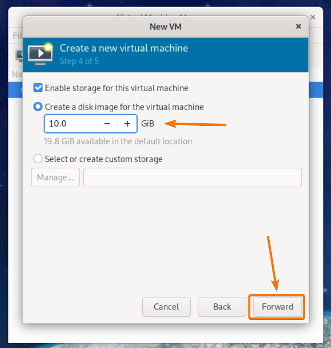 Type in the amount of disk space you want to allocate for this virtual machine (in gigabytes/gibibytes). I will allocate 10 GB of disk space for this virtual machine.