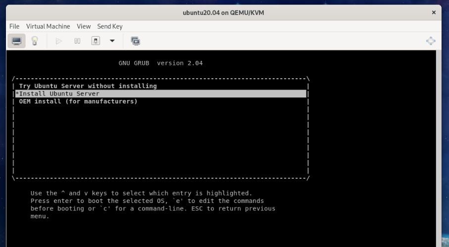 Once you see the following GRUB menu, select Install Ubuntu Server and press <Enter>.