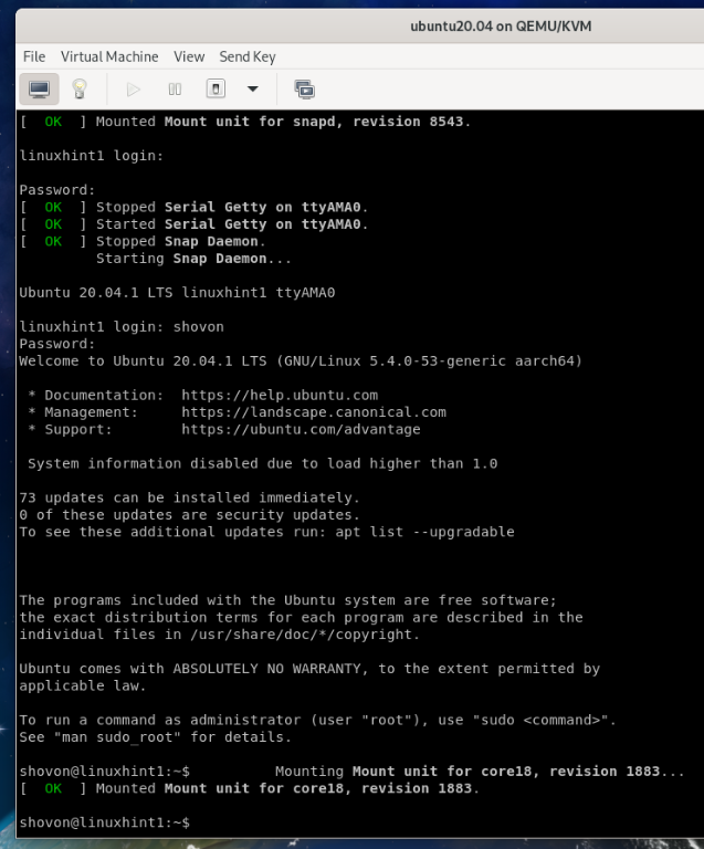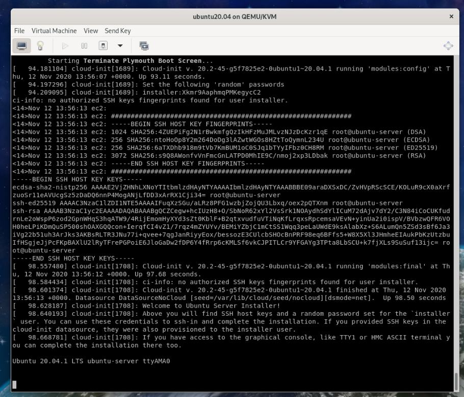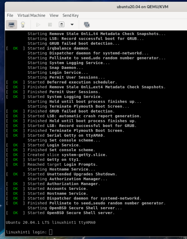 Once the virtual machine boots, you should see the Ubuntu Server 20.04.1 LTS login window.