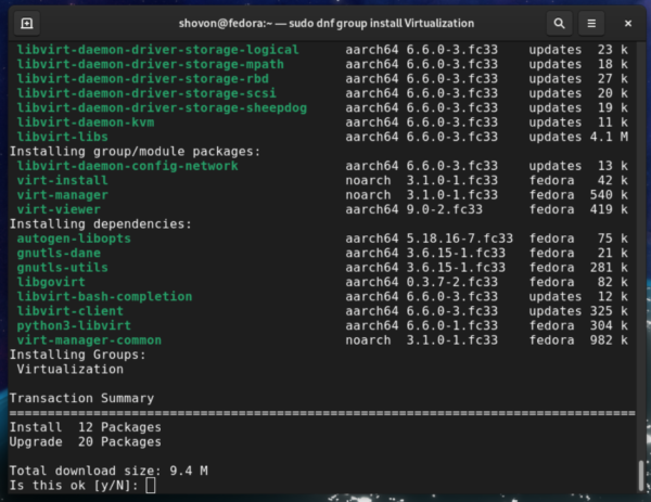 Before you can create KVM virtual machines, you need to have KVM and all the required tools installed on your Fedora Workstation 33. Luckily, KVM and all the required tools are available in the official package repository of Fedora Workstation 33.