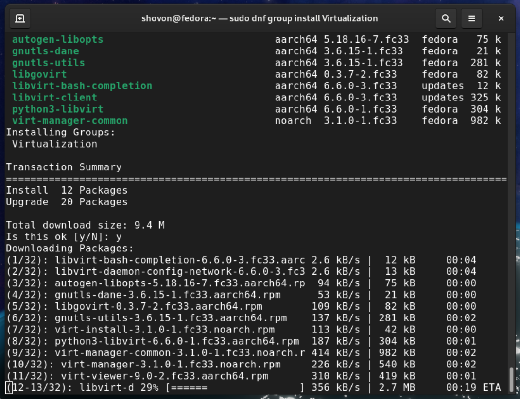 The DNF package manager will automatically download and install all the required packages. It may take a while to complete.