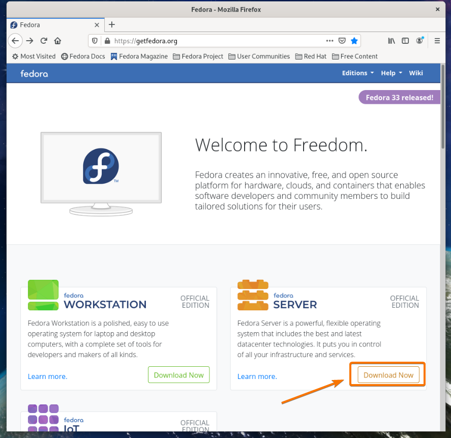 Click on the Download Now button of Fedora Server as marked in the screenshot below.