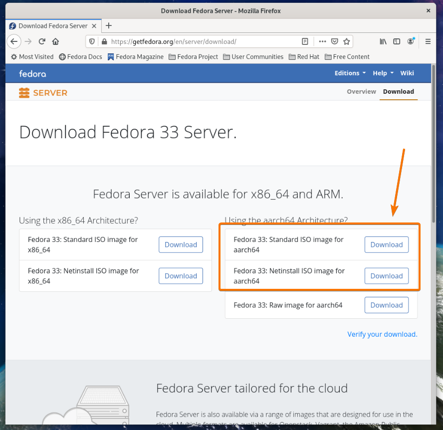 Click on the Download button of either the aarch64 Fedora 33 standard ISO image or the netinstall ISO image as marked in the screenshot below.
