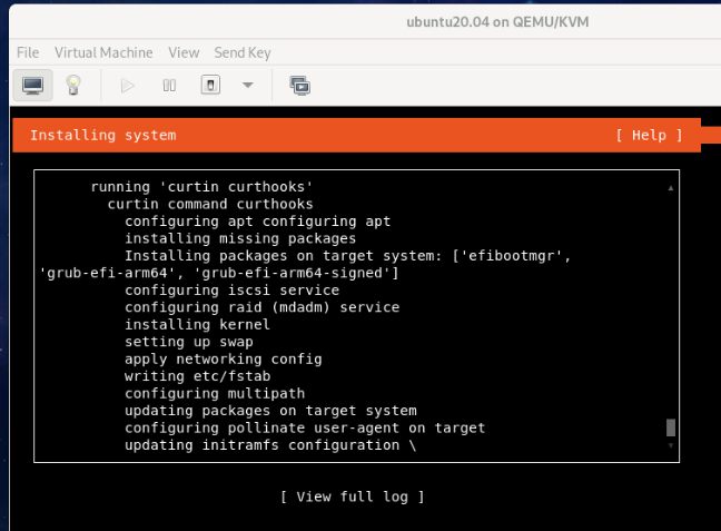Ubuntu installer should start installing Ubuntu Server 20.04 LTS on the virtual machine. It will take a while to complete.