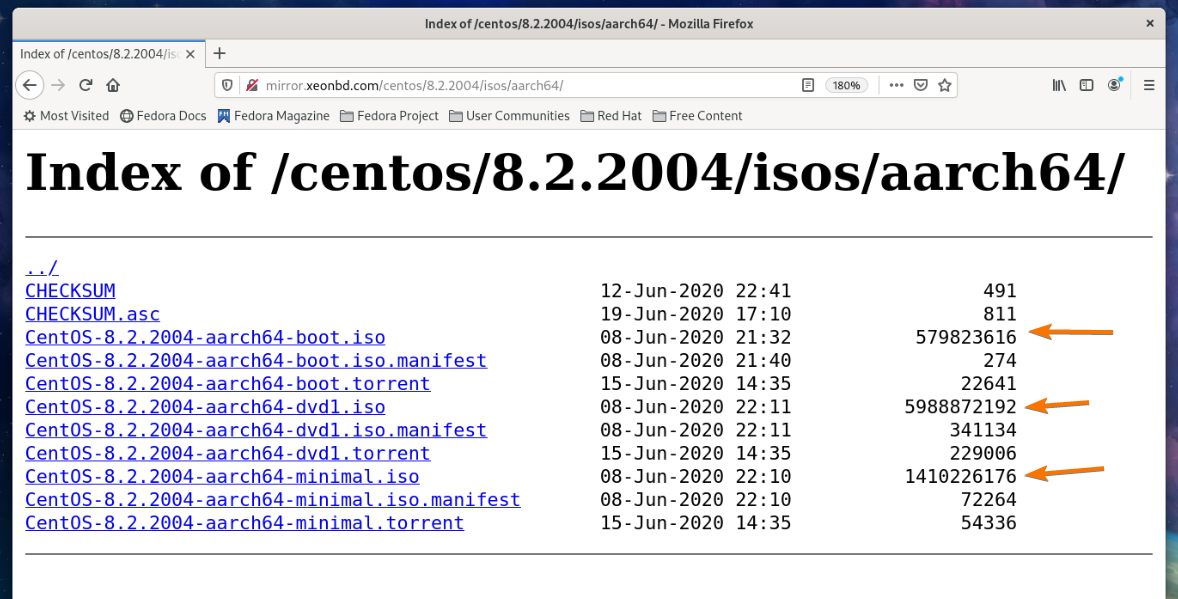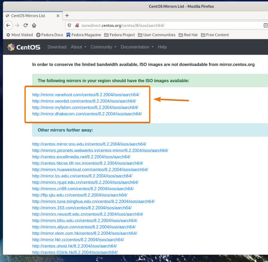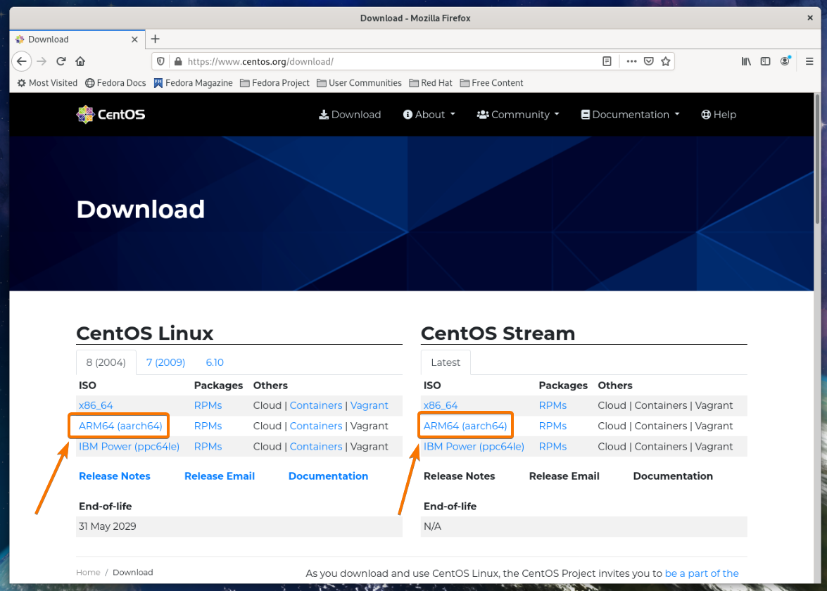 Click on either the CentOS 8 ARM64 (aarch64) or the CentOS Stream ARM64 (aarch64) link as marked in the screenshot below.
