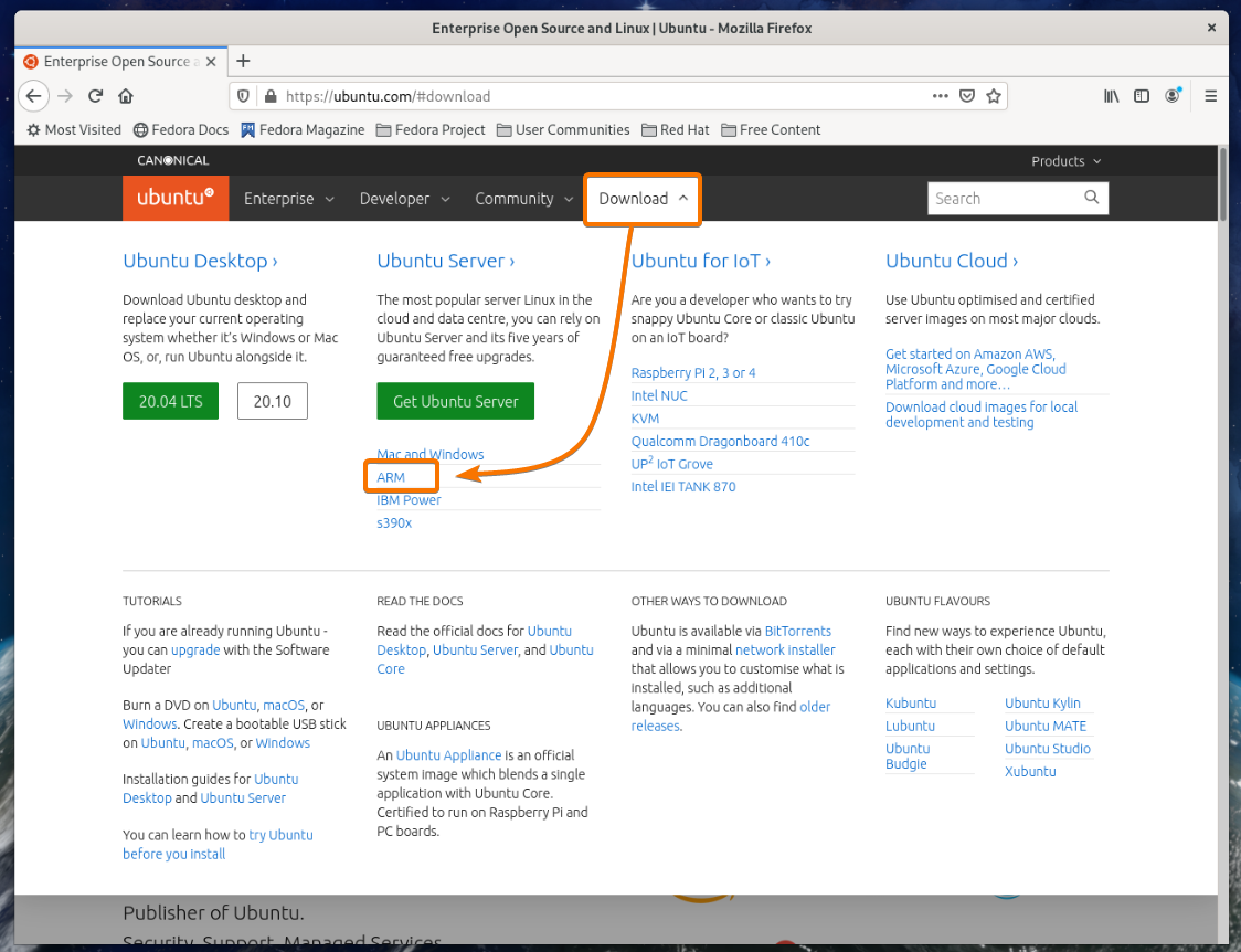 First, visit the official website of Ubuntu. Once the page loads, click on Download and then ARM from the Ubuntu Server section as marked in the screenshot below.