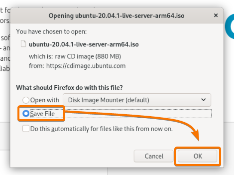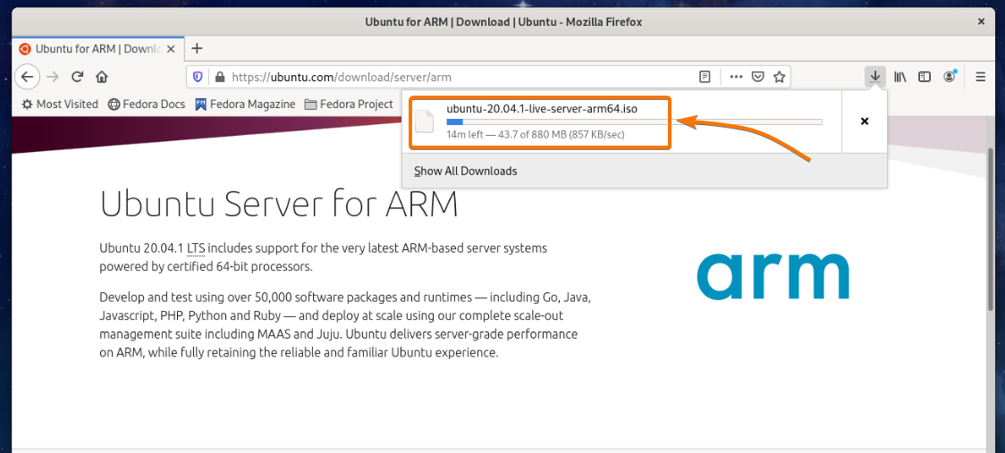 Your browser should start downloading the Ubuntu Server 20.04.1 LTS ARM ISO image. It may take a while to complete.