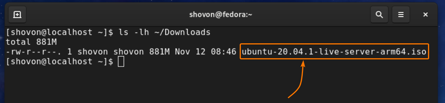 Once the Ubuntu Server 20.04.1 ARM ISO image is downloaded, you should be able to find it in the ~/Downloads directory, as you can see in the screenshot below.