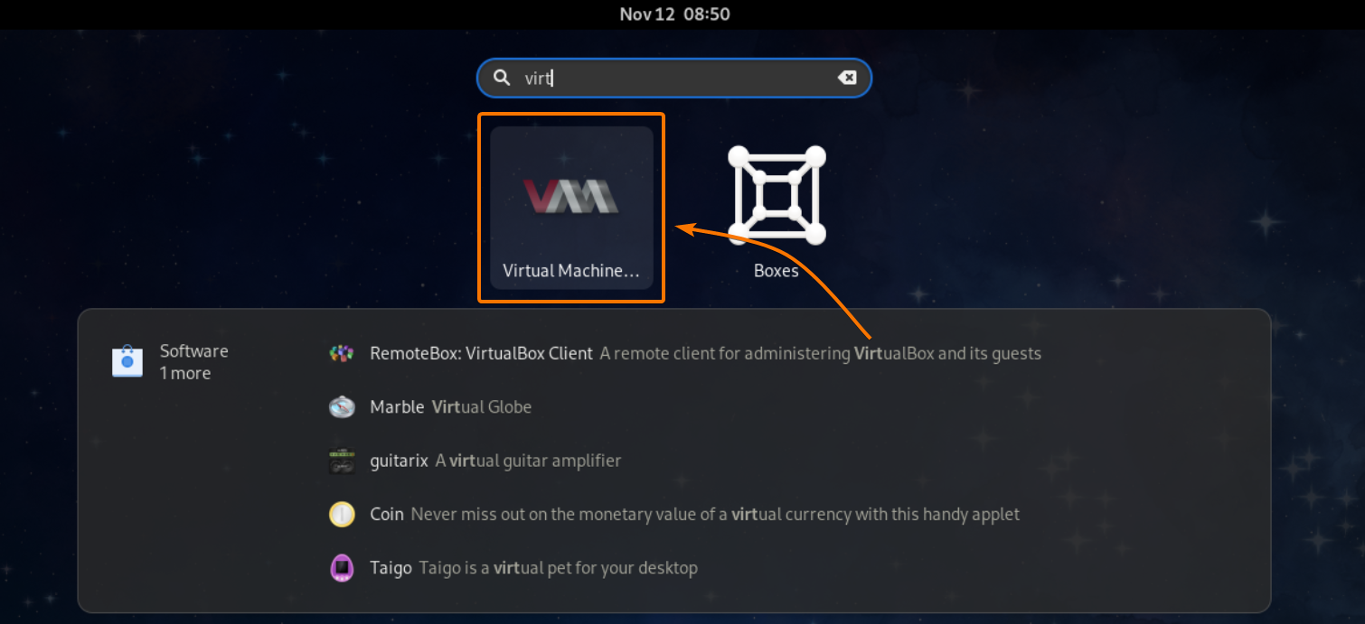 First, search for Virtual Machine Manager in the Application Menu of your Fedora Workstation 33 desktop environment. Then, click on the Virtual Machine Manager icon as marked in the screenshot below.