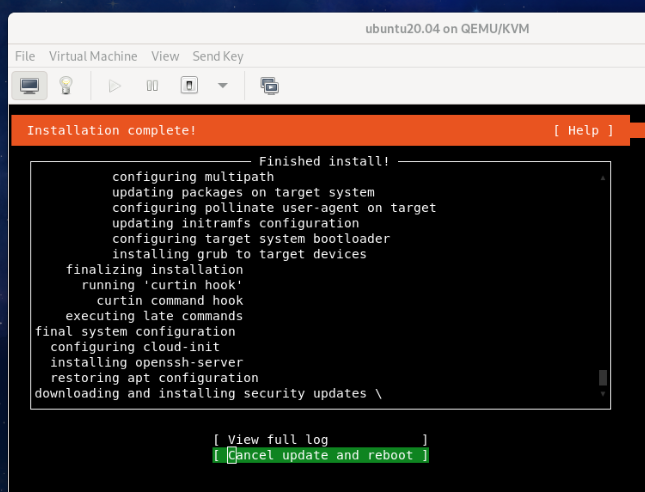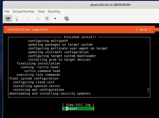 Once the updates are installed, select Reboot and press <Enter> to reboot your virtual machine.