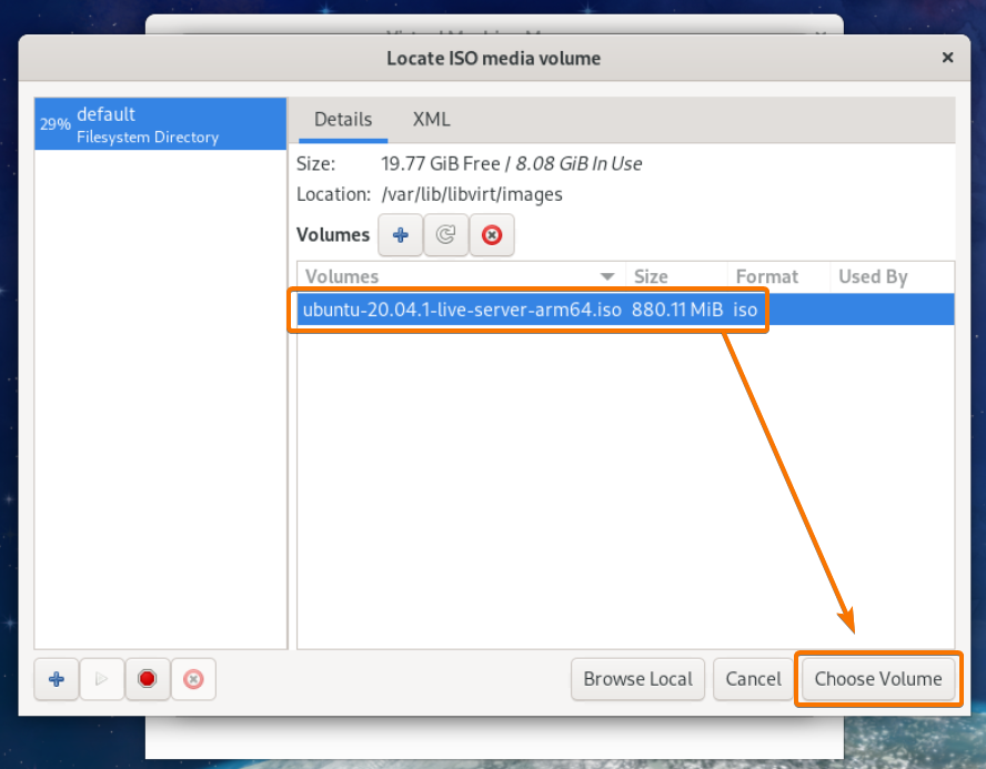 Select the Ubuntu Server 20.04.1 ARM ISO installation image from the list and click on Choose Volume.