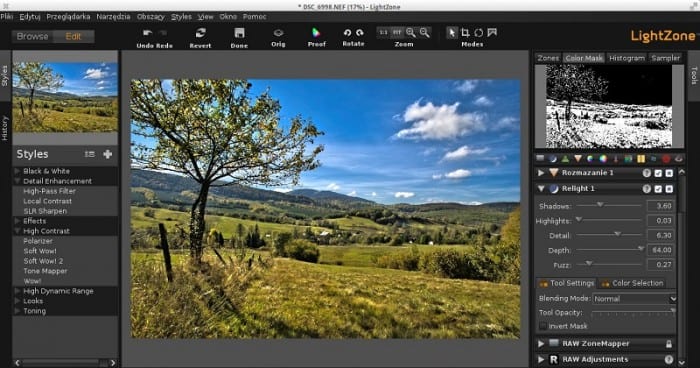 - Non-destructive tools including relight, sharpen, gaussian blur, hue/saturation, color balance, white balance, black & white, noise reduction, clone, spot, red eyes