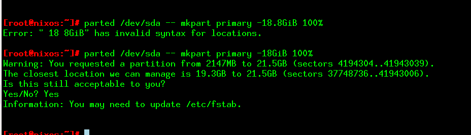 You can fill the disk with parted without knowing its total size. There are many ways to do this, and you saw an example earlier where you put 100% to reach the end of the disk. Other ways to fill your disk is using s; for the sector, %; for the percentage, and chs; for the combined cylinder head and sector. The best part, in this case, is that you can be wrong about where to start, and parted will prompt you for the closest possible solution, and you can answer Yes.