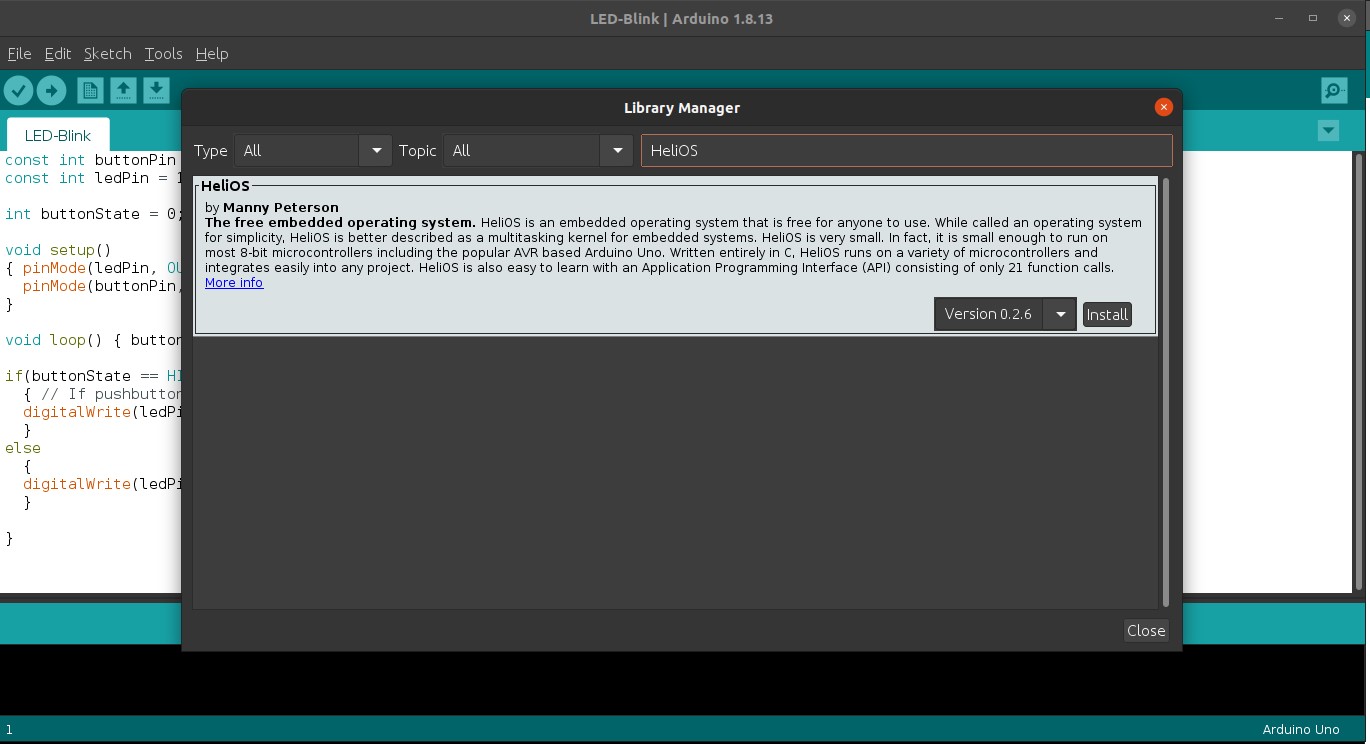 When you run this code you will see that the ‘ledPin’ will blink normally. However, when you push the button, it will not light up, or if it does, it will delay the blink sequence. To make this program work, you can switch to other delay methods; however, HeliOS provides an alternative.