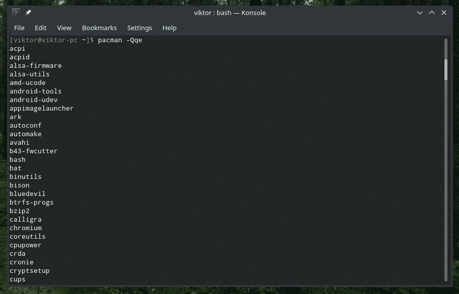 It’s better to elaborate on the working method of “pipe” with a live example, right? Let’s get started. The following command will tell “pacman”, the default package manager for Arch and all the Arch-based distros, to print out all the installed packages on the system.