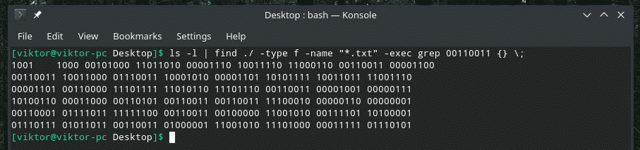 This is a pretty twisted command, right? At first, “ls” outputs the list of all files in the directory. The “find” tool takes the output, searches for “.txt” files and summons “grep” to search for “00110011”. This command will check every single text file in the directory with the TXT extension and look for the matches.