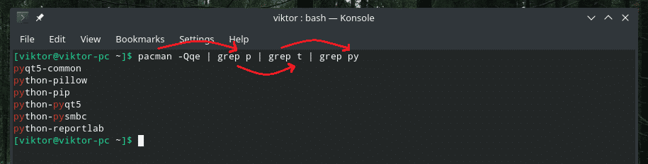 The pacman command output is filtered further and further by “grep” through a series of piping.