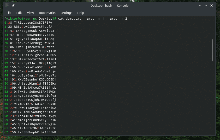 Sometimes, when we’re working with the content of a file, it can be really, really large. Finding out the right place of our desired entry can be difficult. Let’s search for all the entries that include digits 1 and 2.