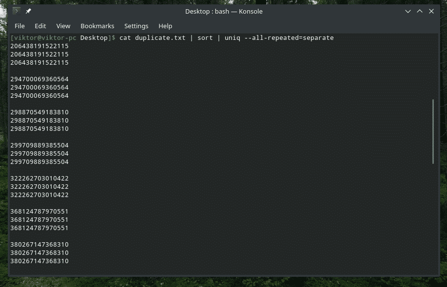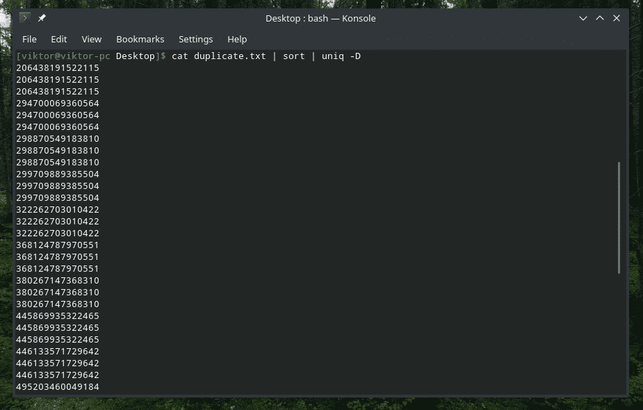 Yes, “uniq” is also able to do that. In this case, you have to use the “-D” option. I’ll be using “sort” in-between to have a better, more refined result.