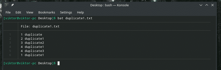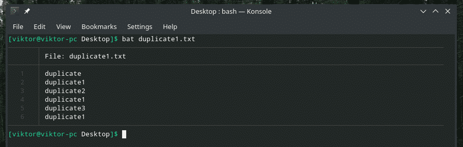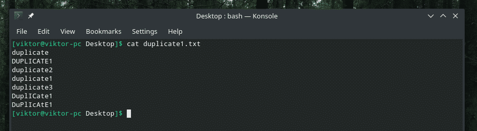 Let’s check out this example. I’ve created another “duplicate1.txt” file that contains duplicate items. However, they’re not adjacent to each other.