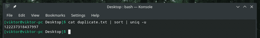 According to all the examples mentioned above, “uniq” only keeps the first occurrence of the duplicated content and removes the rest. How about removing the duplicate contents altogether? Yes, using the flag “-u”, we can force “uniq” to keep the non-repetitive lines only.