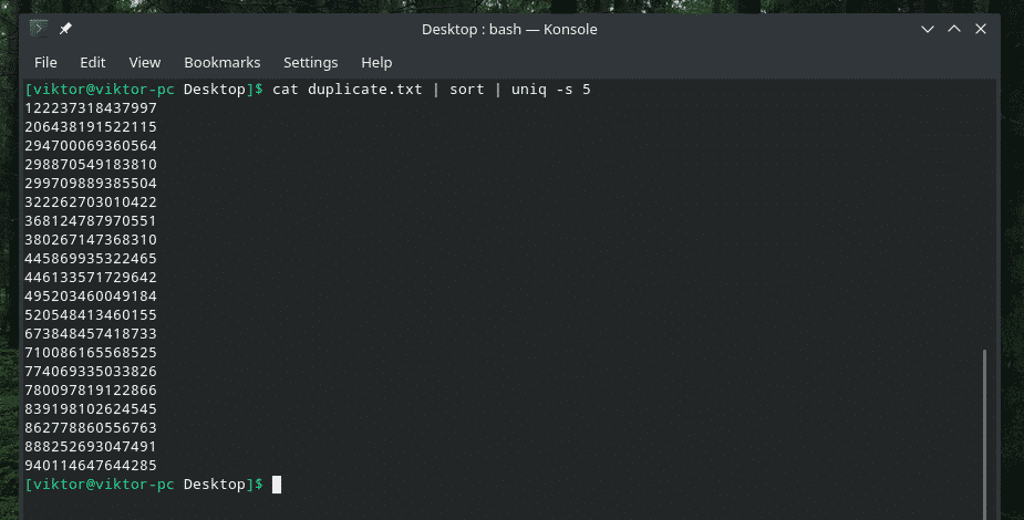 We discussed how to tell “uniq” to do its job for other fields, right? It’s time for starting the check after a number of initial characters. For this purpose, the “-s” flag accompanied by the number of characters is going to tell “uniq” to do the job.