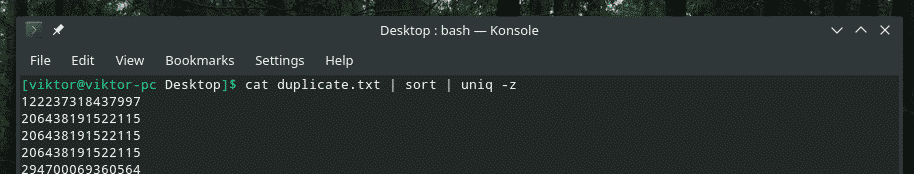 The default behavior of “uniq” is to end the output with a newline. However, the output can also be terminated with a NULL. That’s pretty useful if you’re going to use it in scripting. Here, the flag “-z” is what does the job.