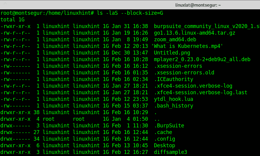 If you want to print in a specific size unit only instructing ls to display all files with the closest size in that unit only you can achieve it, for example, to print all files in MB you can add –block-size= options specifying MB with M as shown in the syntax and screenshot below: