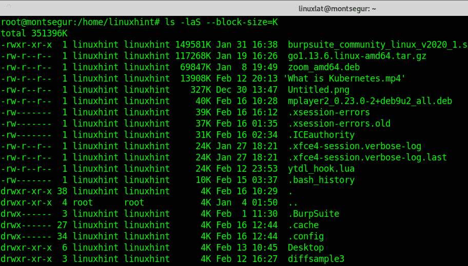 All the examples above will list files and directories sorted by size in the unit you want, with the clarified problem mentioned above the output wont be accurate for files which don’t match a exact unit size. Additionally, these examples didn’t include hidden files (which start with a .). To do so, you will need to add the option -a (all) which will display hidden files too, therefore, to print files sorted by size by bytes run: