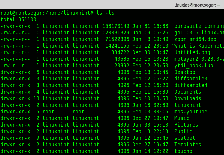If you want to sort this output according to file size, from bigger to smaller you need to add the -S (Sort) option.