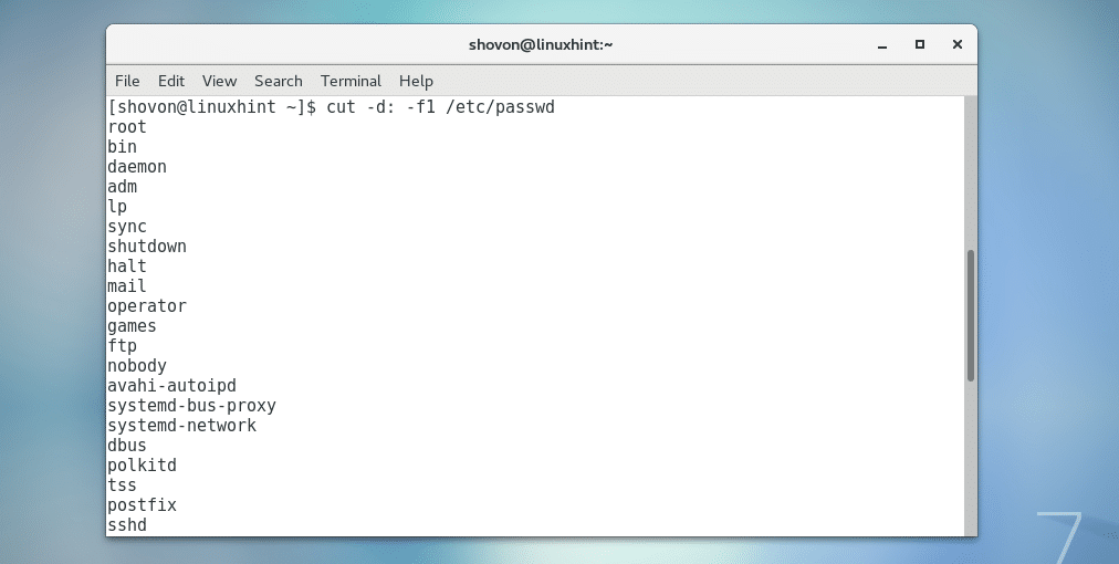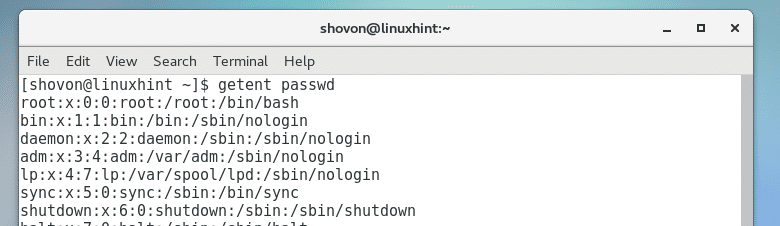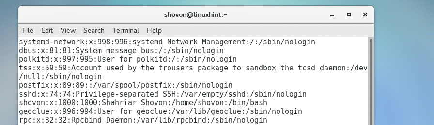 As you can see, a list of all the users is printed. Information about a single user is stored in a single line /etc/passwd file. Each line contains a lot of information about that specific users separated by colon (:)