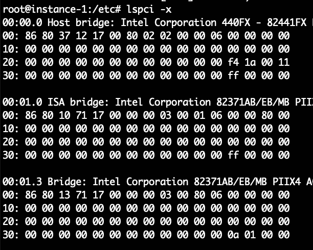 Lastly you can even see a hexadecimal dump of “the standard part of the configuration space” for each PCI device. You should be a real kernel hacker to figure out how to use that information. -x option is what gives you the dump output.