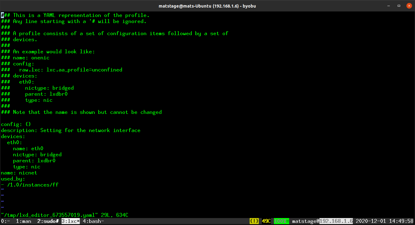 The resulting output is a YAML file. All your profiles will be in the same format. With LXC itself, you can create, remove, and edit your profile. You can see in the file that the default uses the lxdbr0 network and type nic. Now, create a new profile using the following: