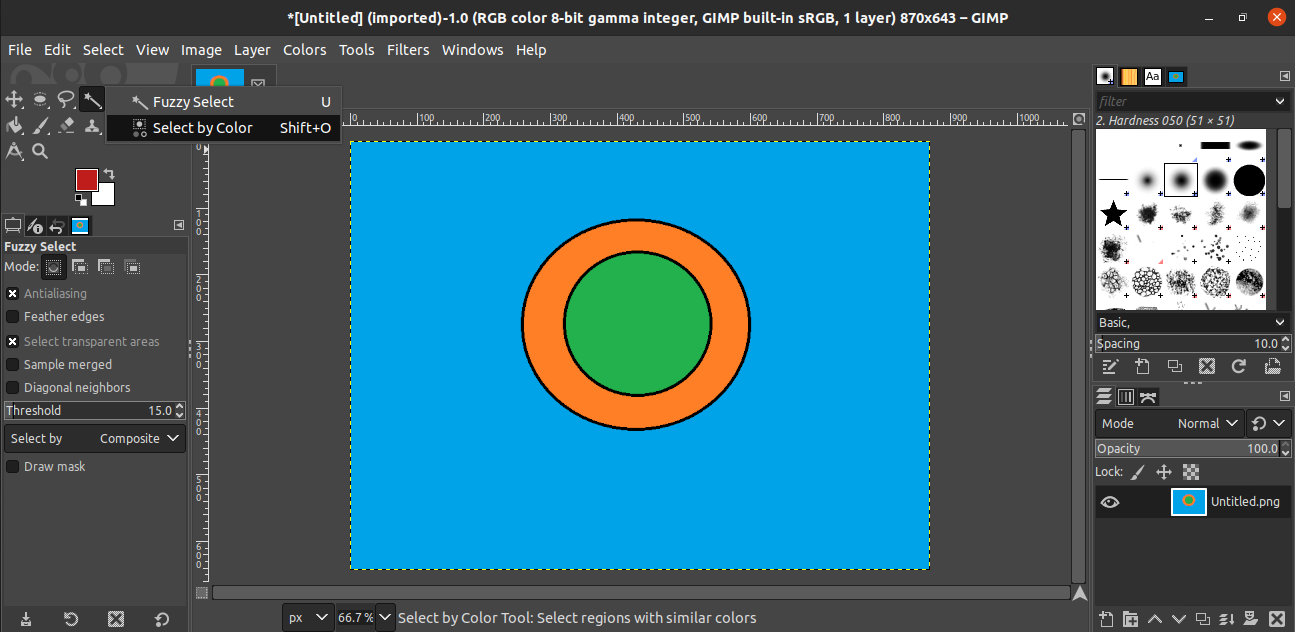Now, it is time to select the background. GIMP offers two tools for selecting the background: the Color tool and the Fuzzy Select tool. In this method, we will select the Color tool from the left sidebar. Alternatively, you can use the Shift + O keyboard shortcut to open this tool.