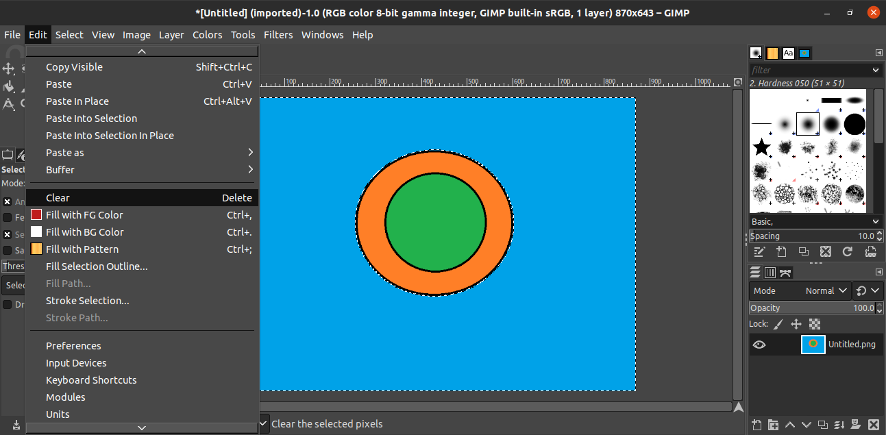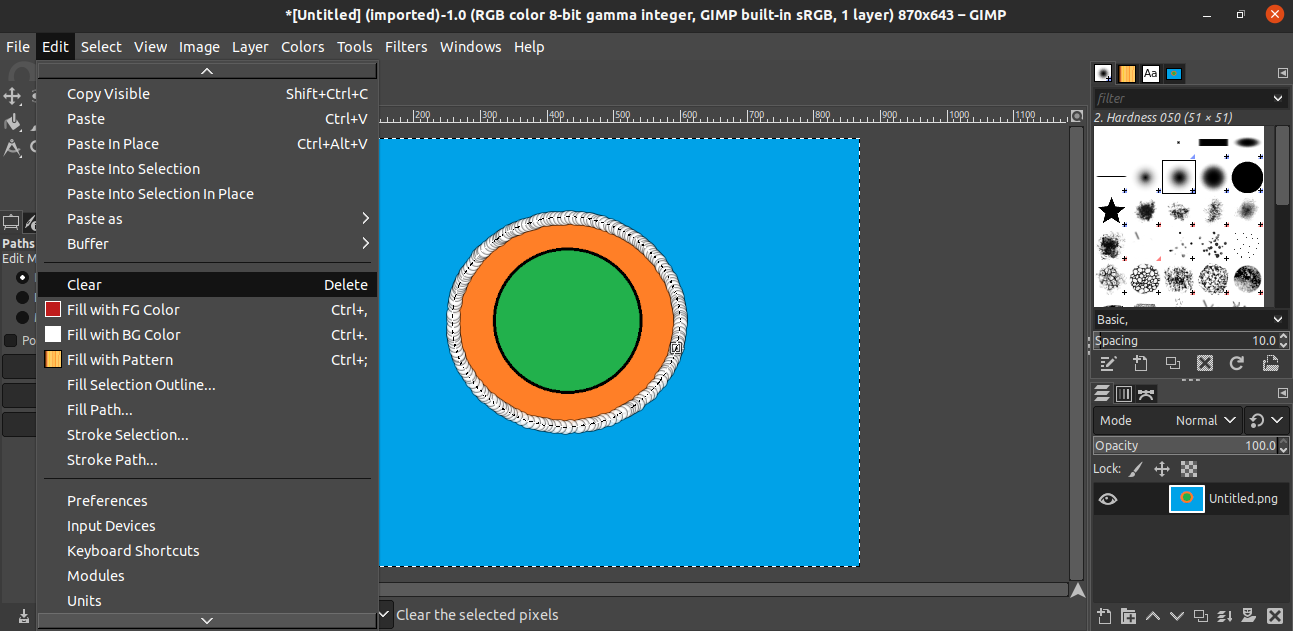 Once the background has been highlighted, it is now time to delete it. To delete the selected area, go to Edit >> Clear. Alternatively, use the keyboard shortcut Delete.