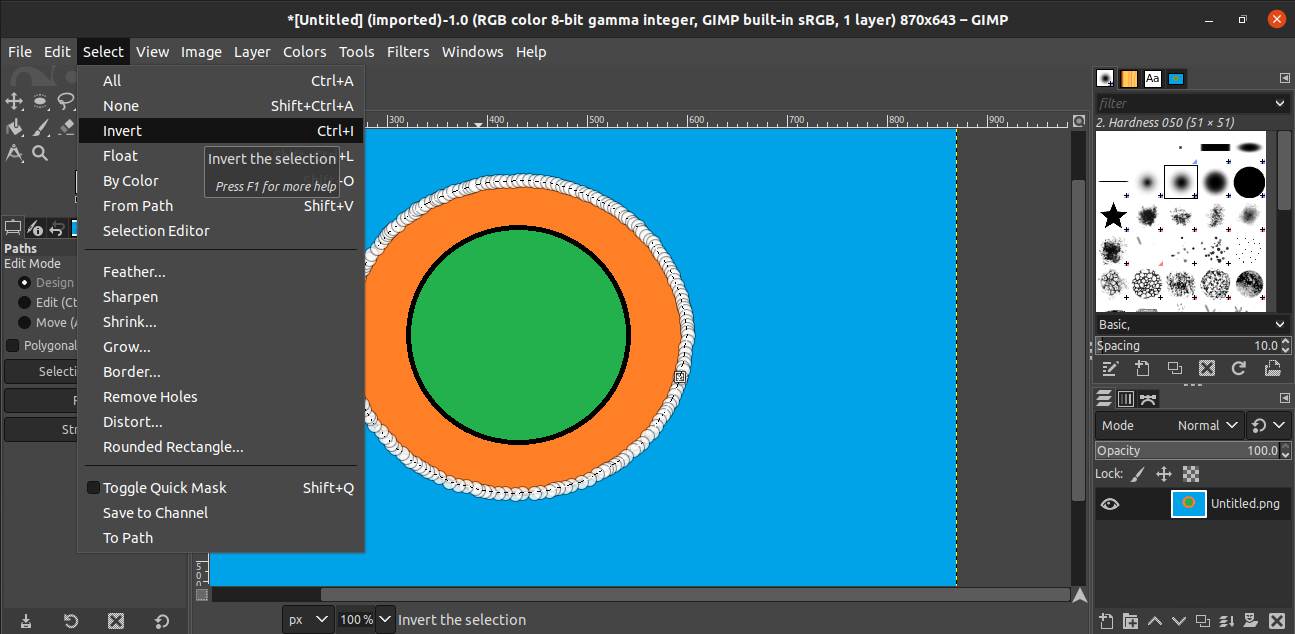 We have selected the part we want to keep, and now, we must invert the selection. This way, GIMP will select all the remaining portions to delete. In this case, the deleted portion will be the background. To invert the selected portion, go to Select >> Invert. Alternatively, use the Ctrl + I keyboard shortcut.