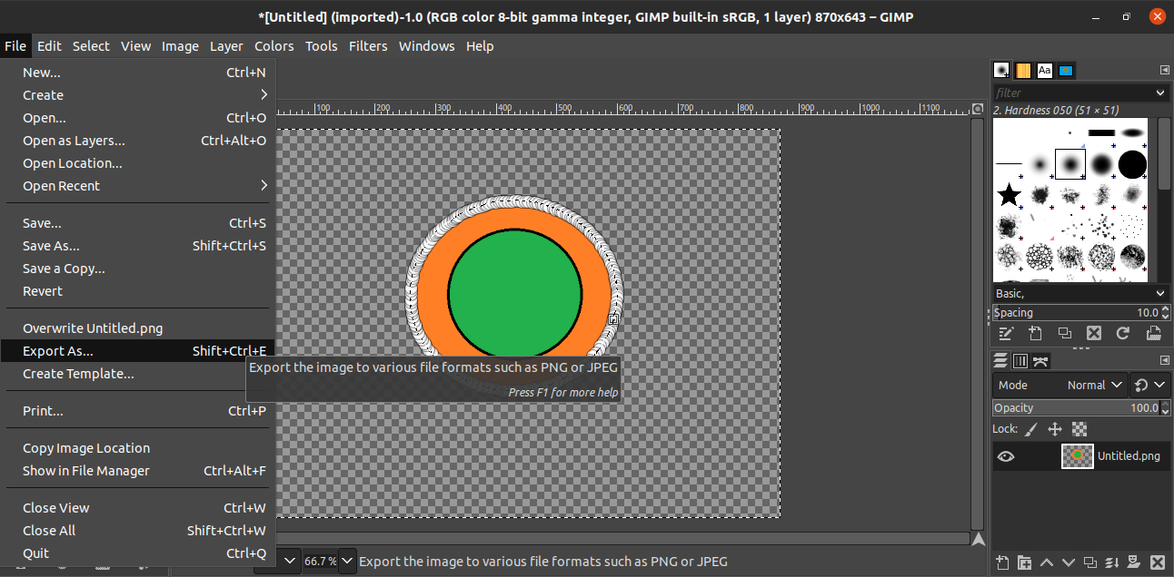 Once the background of the image has been removed, it is now time to save the transparent image. To export the transparent image as a different image, go to File >> Export As. Alternatively, use the Shift + Ctrl + E keyboard shortcut.