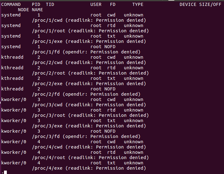 In the above table of lsof command, FD represents file description, cwd represents the current working directory, txt means text file, mem means memory-mapped files, mmap means memory-mapped devices, REG represents a regular file, DIR represents Directory, rtd means root directory. There are other options you can use with the lsof command.