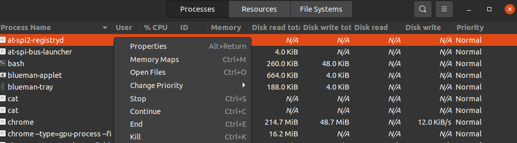 - Change Priority- display a sidebar from which you can renice the process with the options from very high to very low and custom.