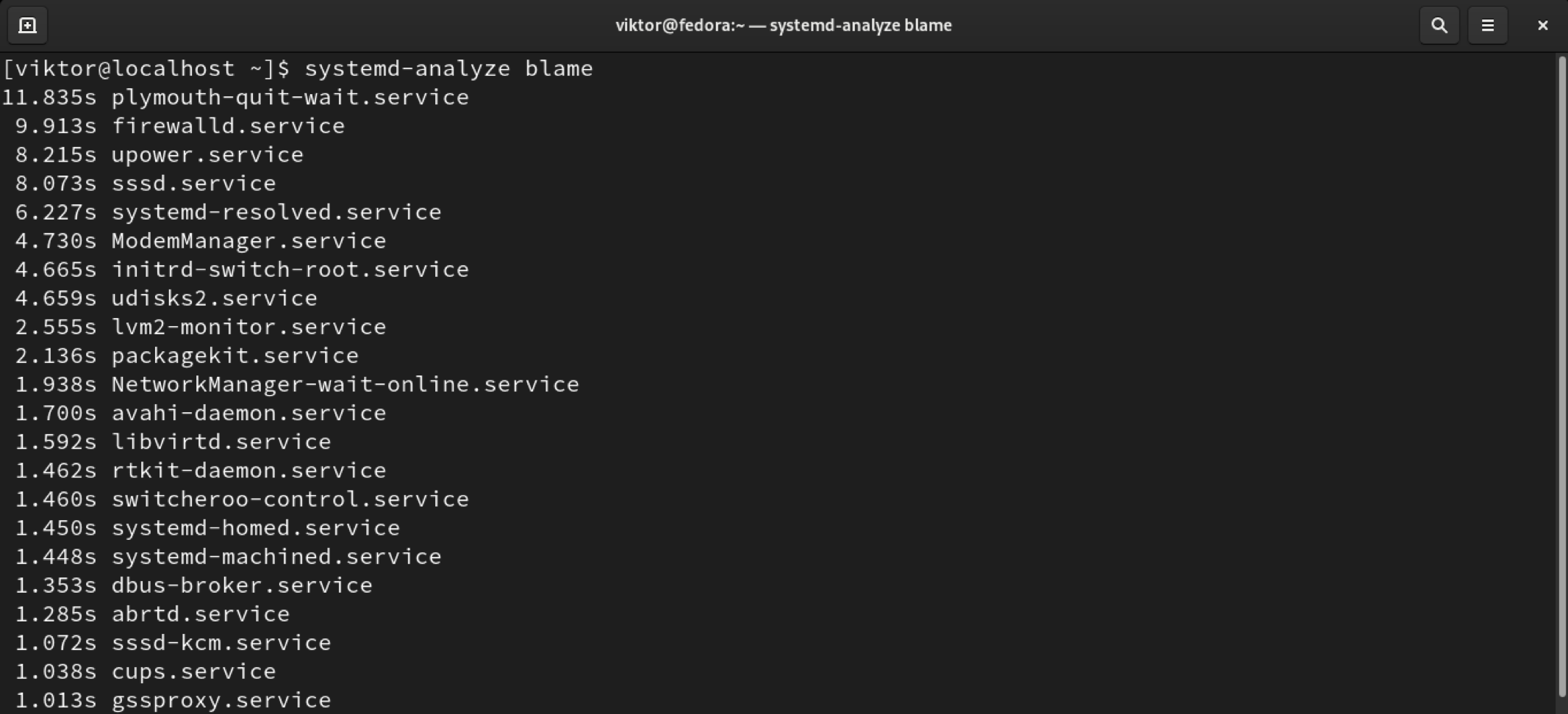When booting, each service requires time to load completely. To determine how much time services spend during boot, run the following command.