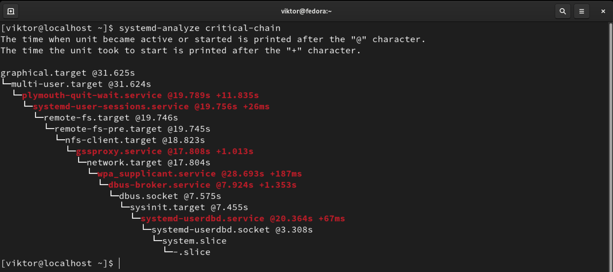 Using systemd-analyze, you can also analyze the critical chain at boot. Run the following command to see the report.